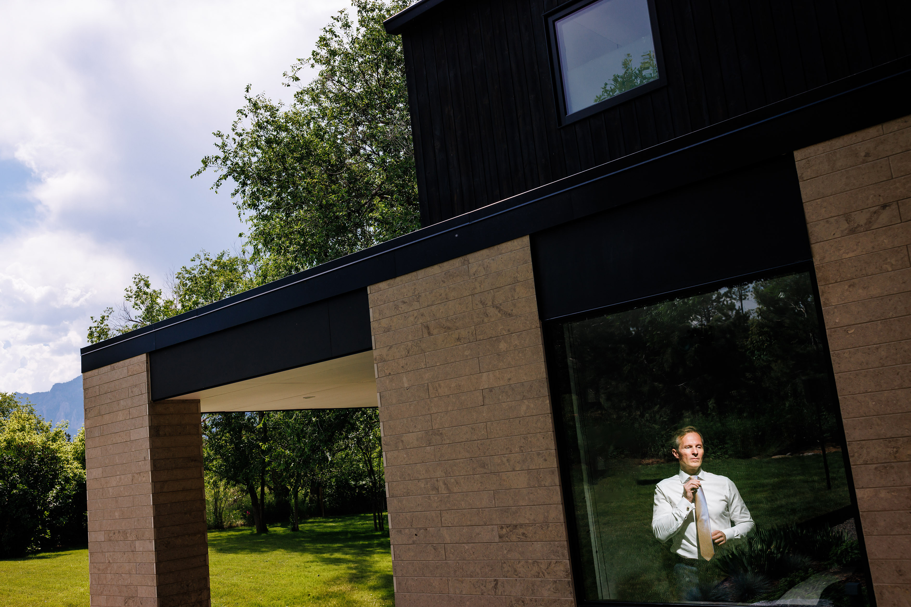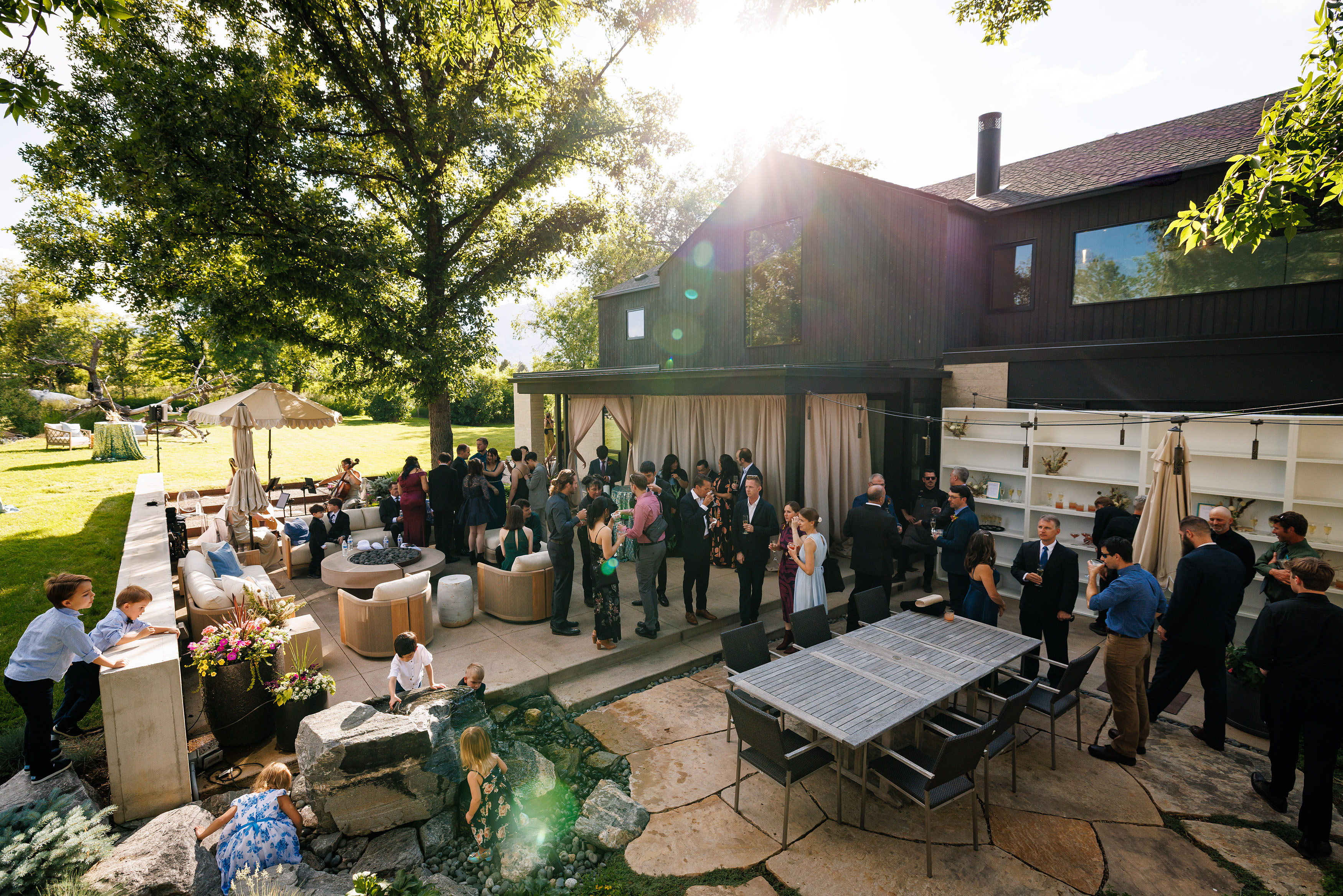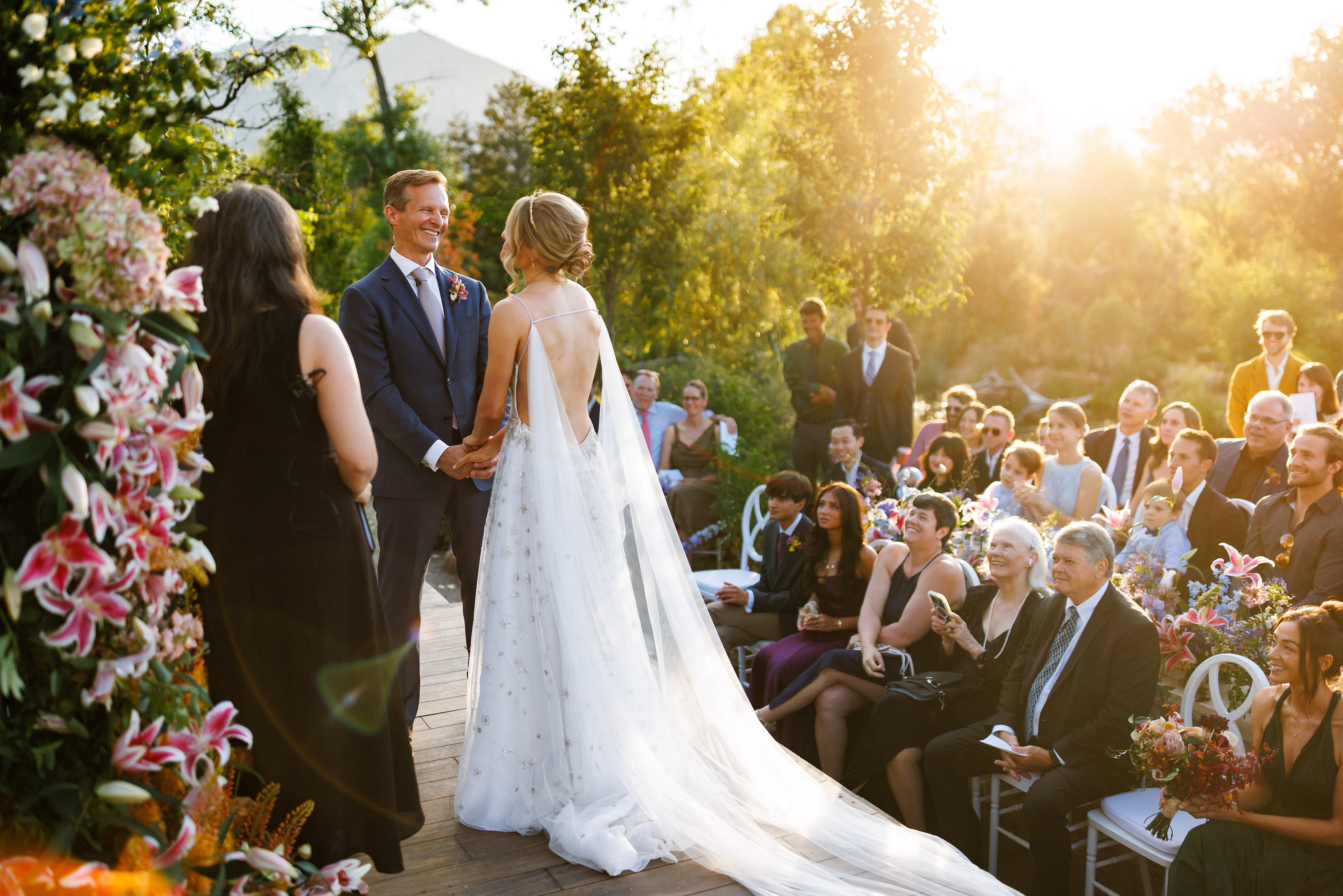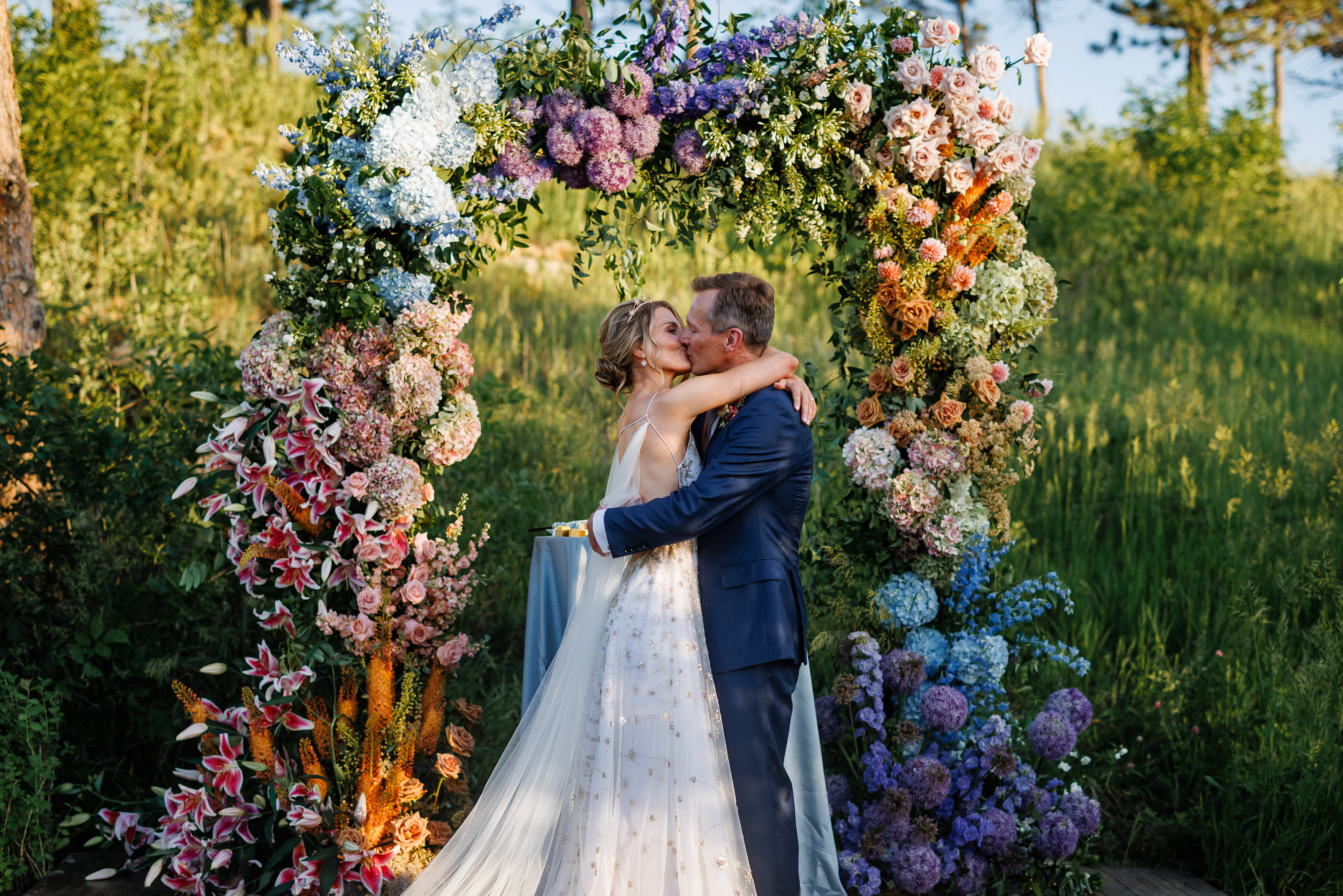 Saturday greeted us with the kind of weather every couple dreams about—clear blue skies and crisp Colorado sunshine. Guests made their way to the couple’s private residence just outside of Boulder, a stunning property with sweeping views that felt both intimate and grand. The ceremony space was beautifully decorated, blending natural textures and romantic florals in a way that complemented the mountain setting. As the couple exchanged vows, it was impossible not to feel the sense of love, joy, and anticipation in the air.