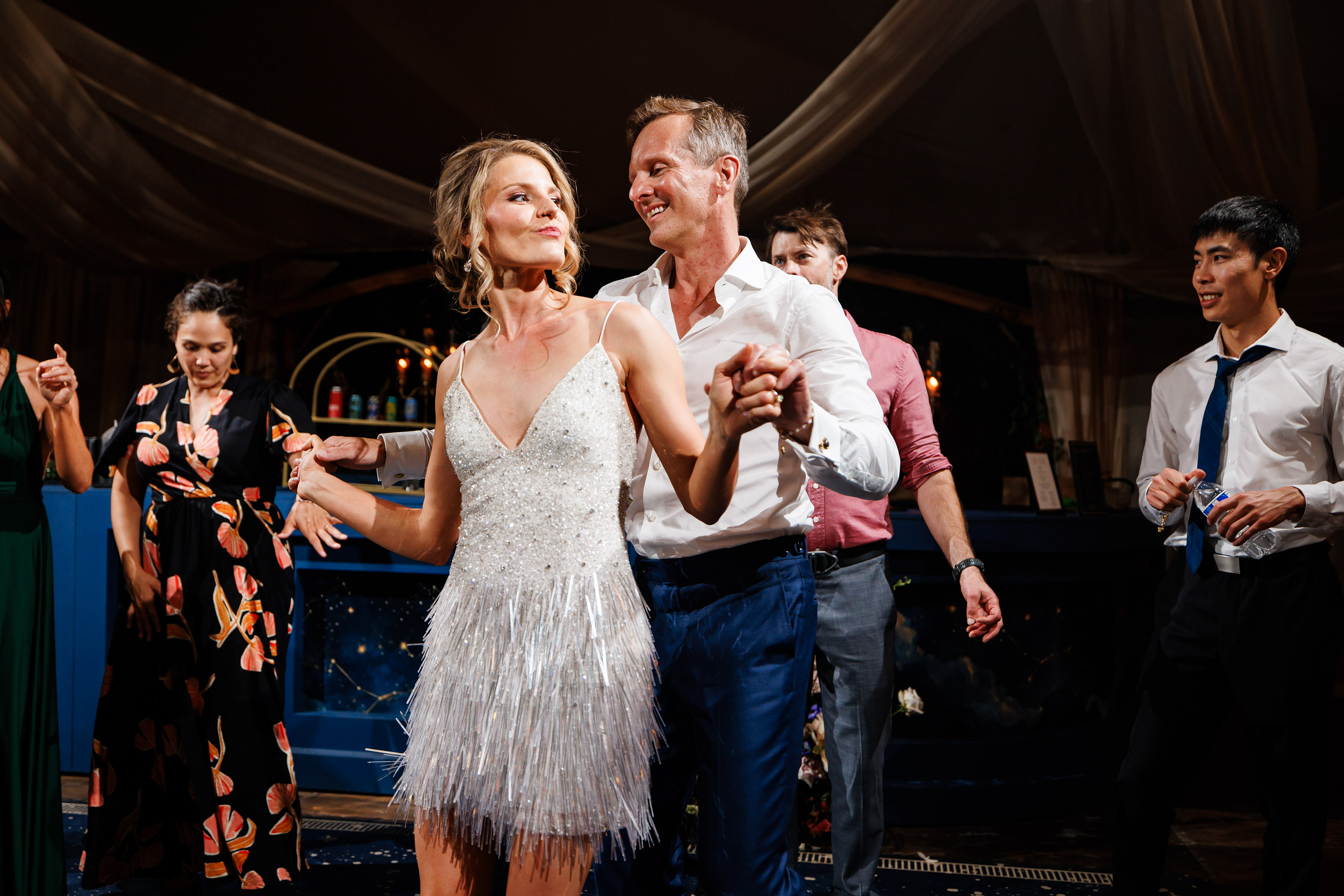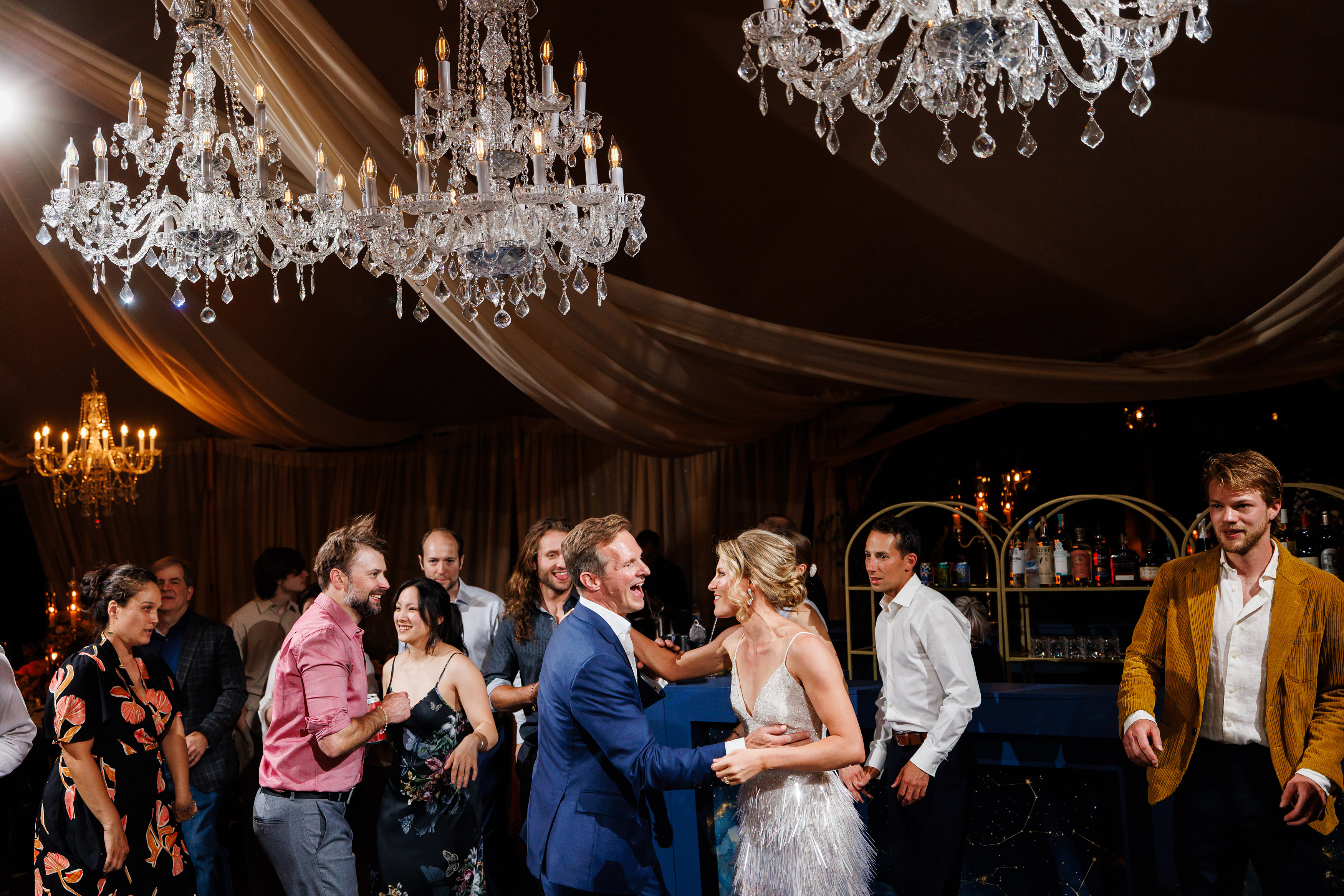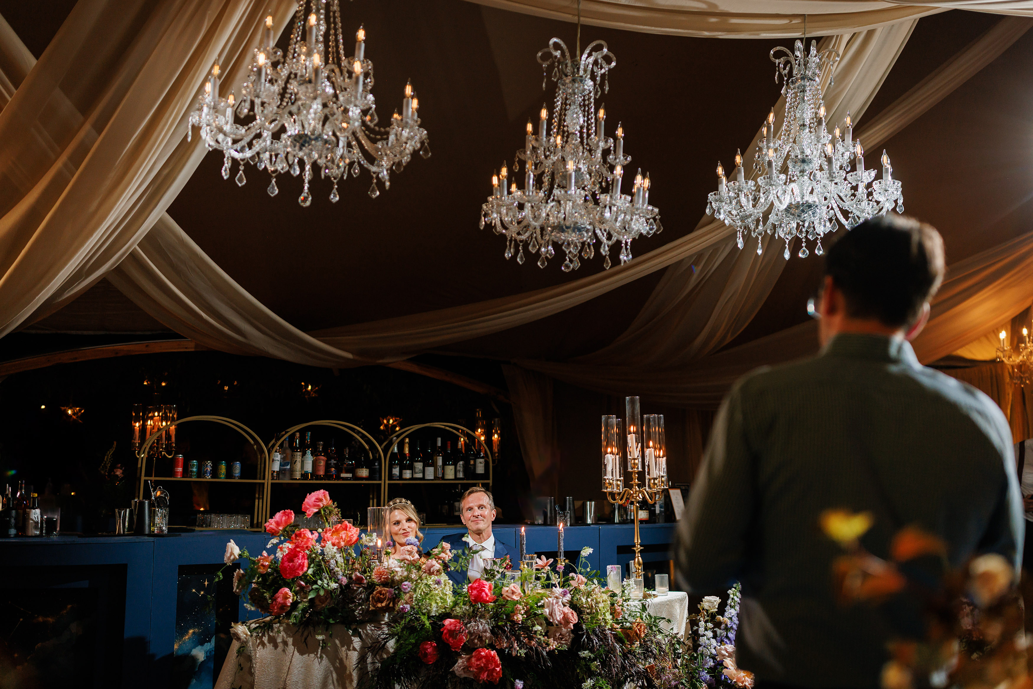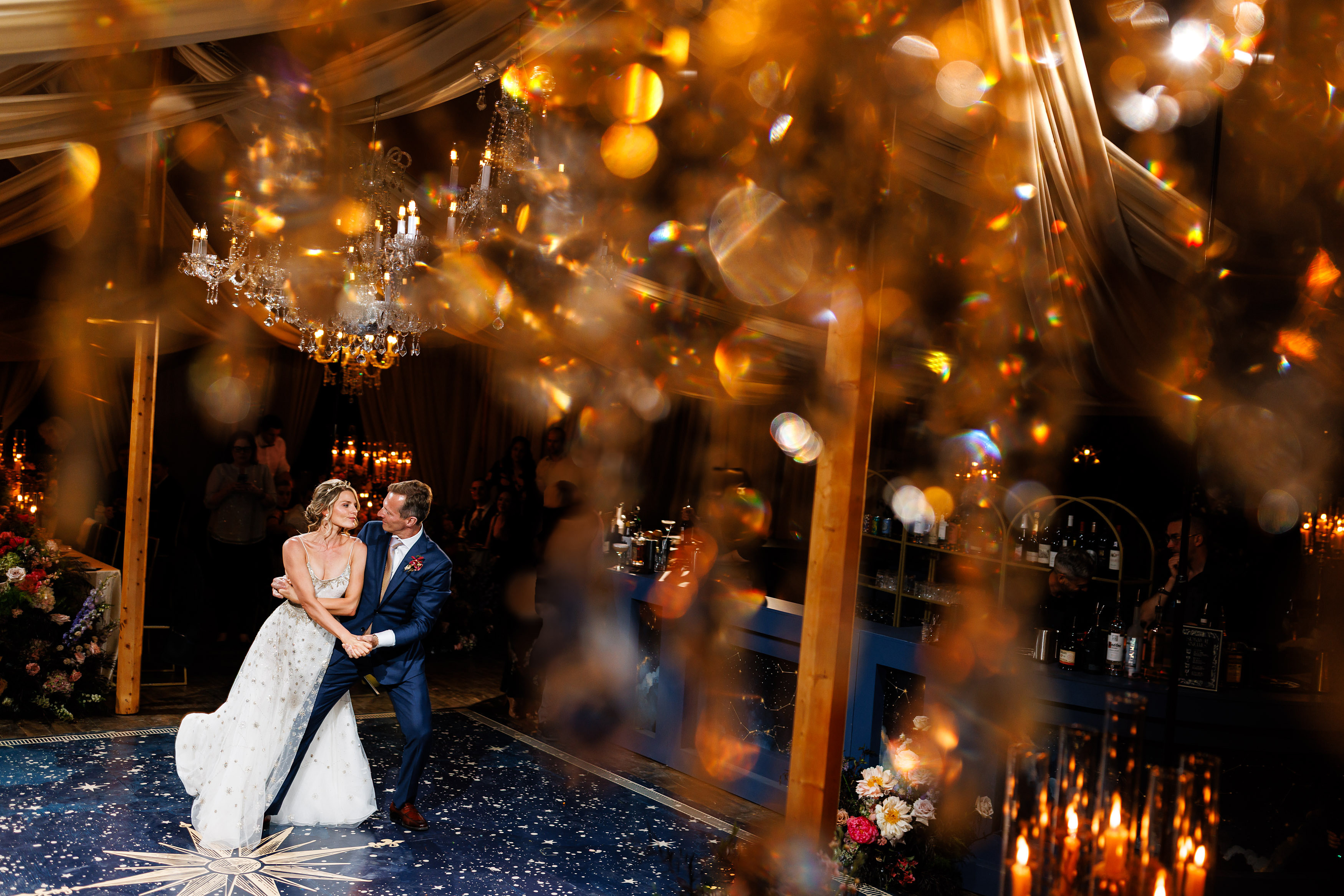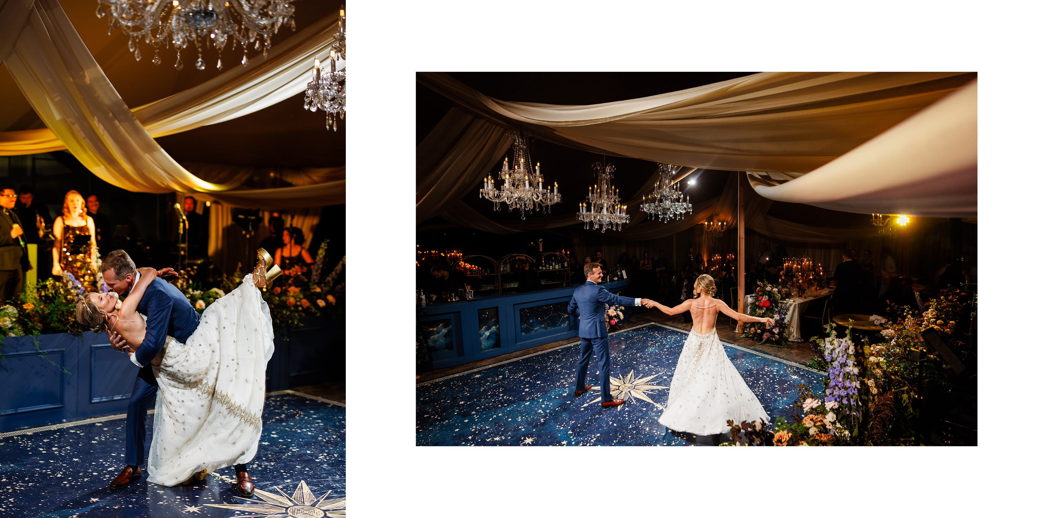 From there, the wedding day became an immersive journey designed to take guests through different “worlds.” The reception began with themes of land, with earthy details and grounded elegance. As the evening unfolded, guests were swept into elements of the sea, where the décor and ambiance shifted into something fluid, vibrant, and full of life. Finally, as night fell, the celebration reached its dazzling conclusion under the stars at a hidden speakeasy bar. Guests danced, toasted, and reveled in an atmosphere that felt as limitless as the universe itself.