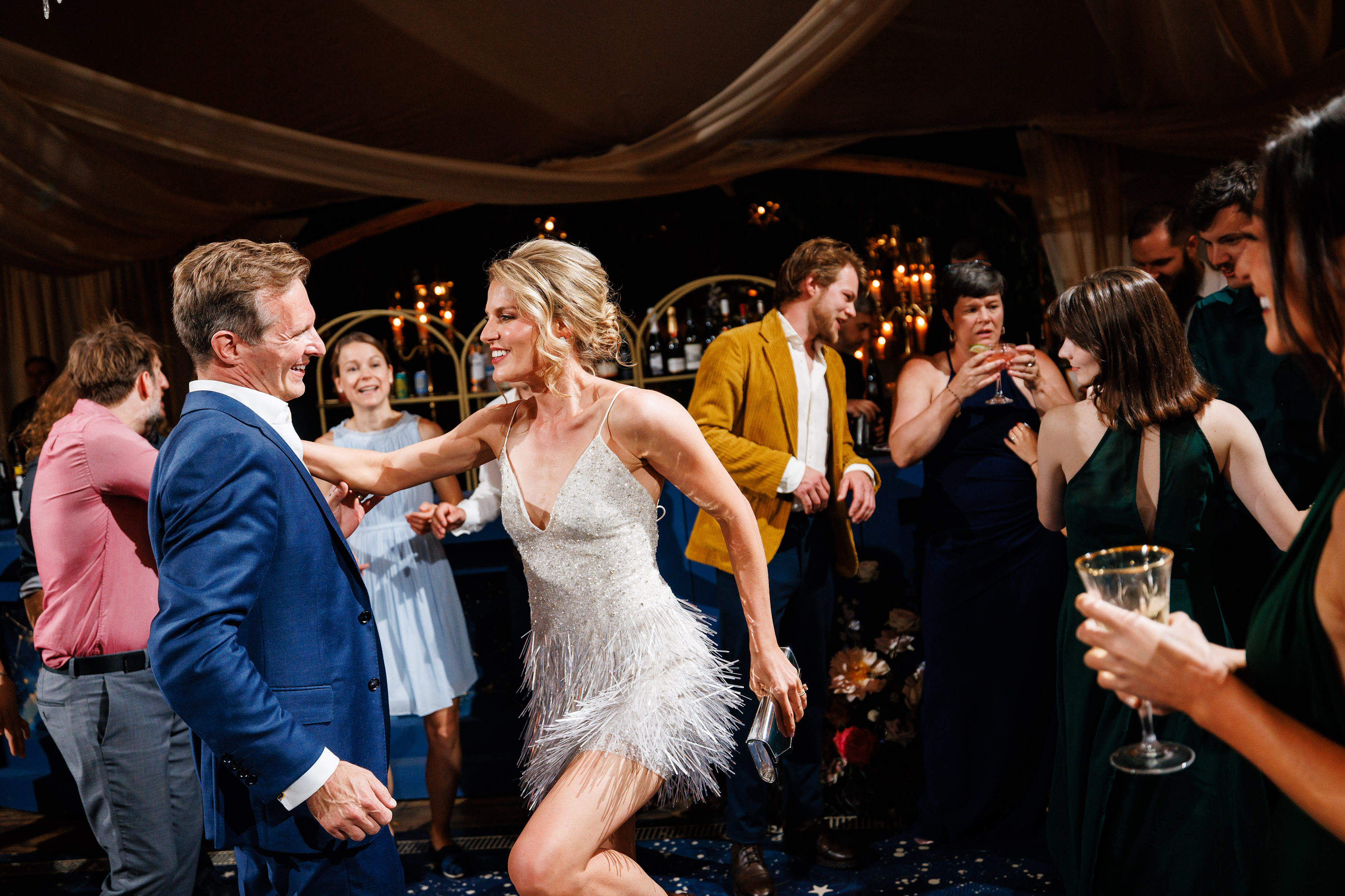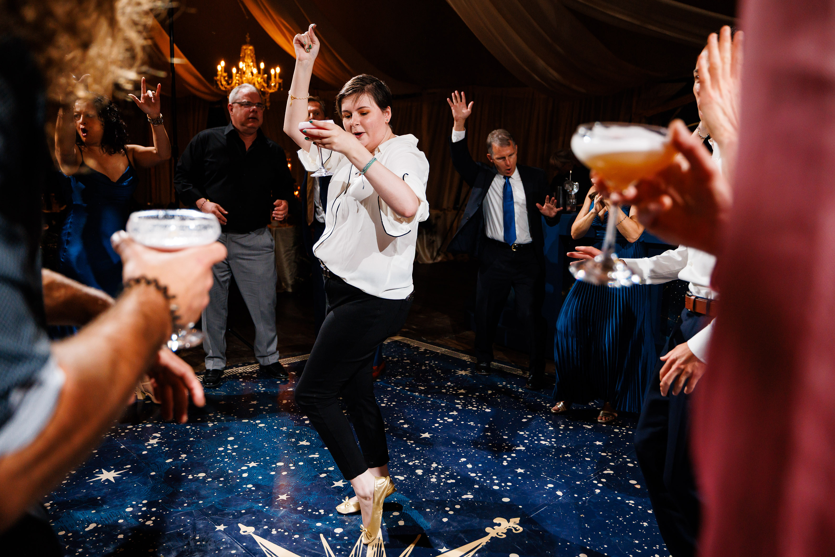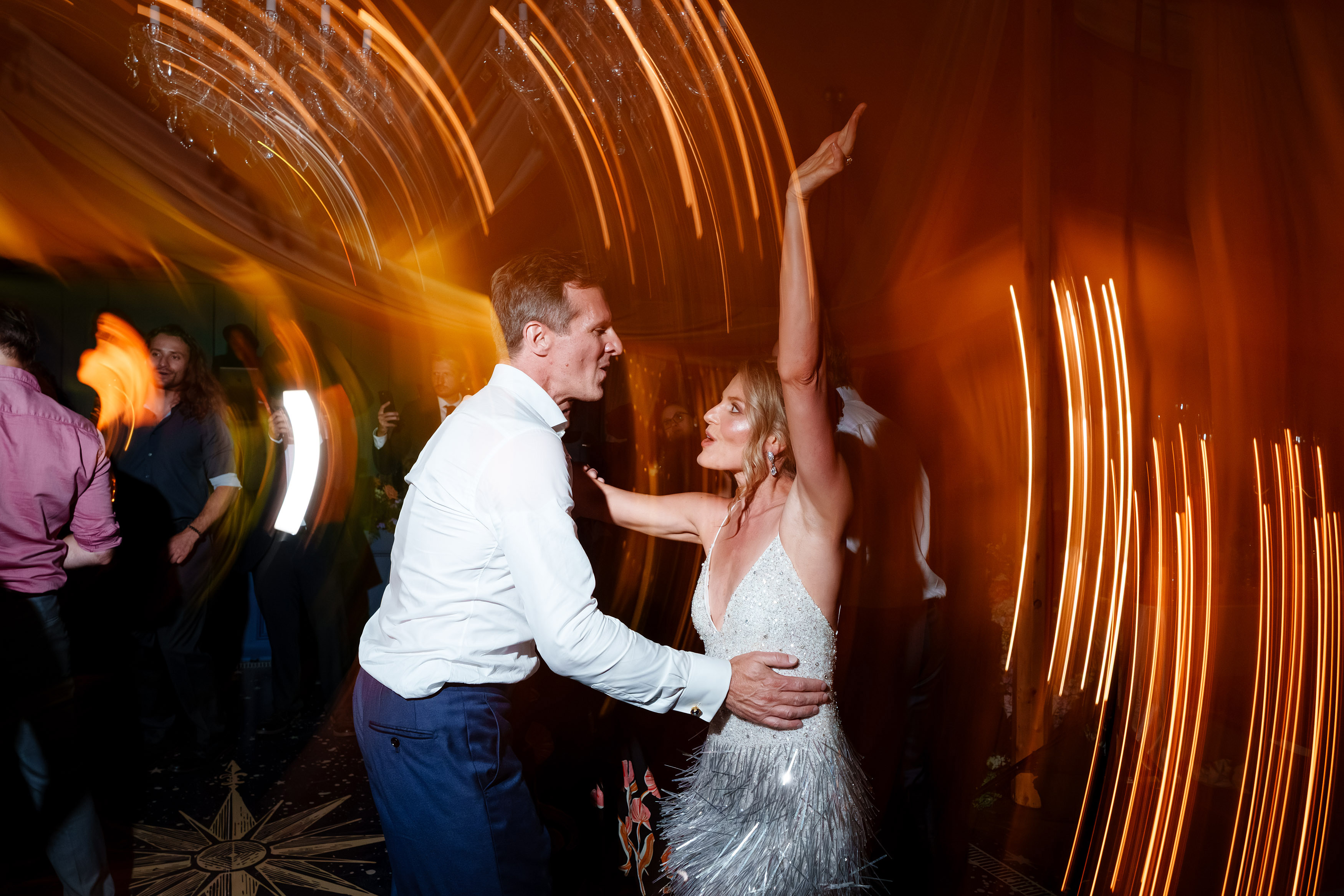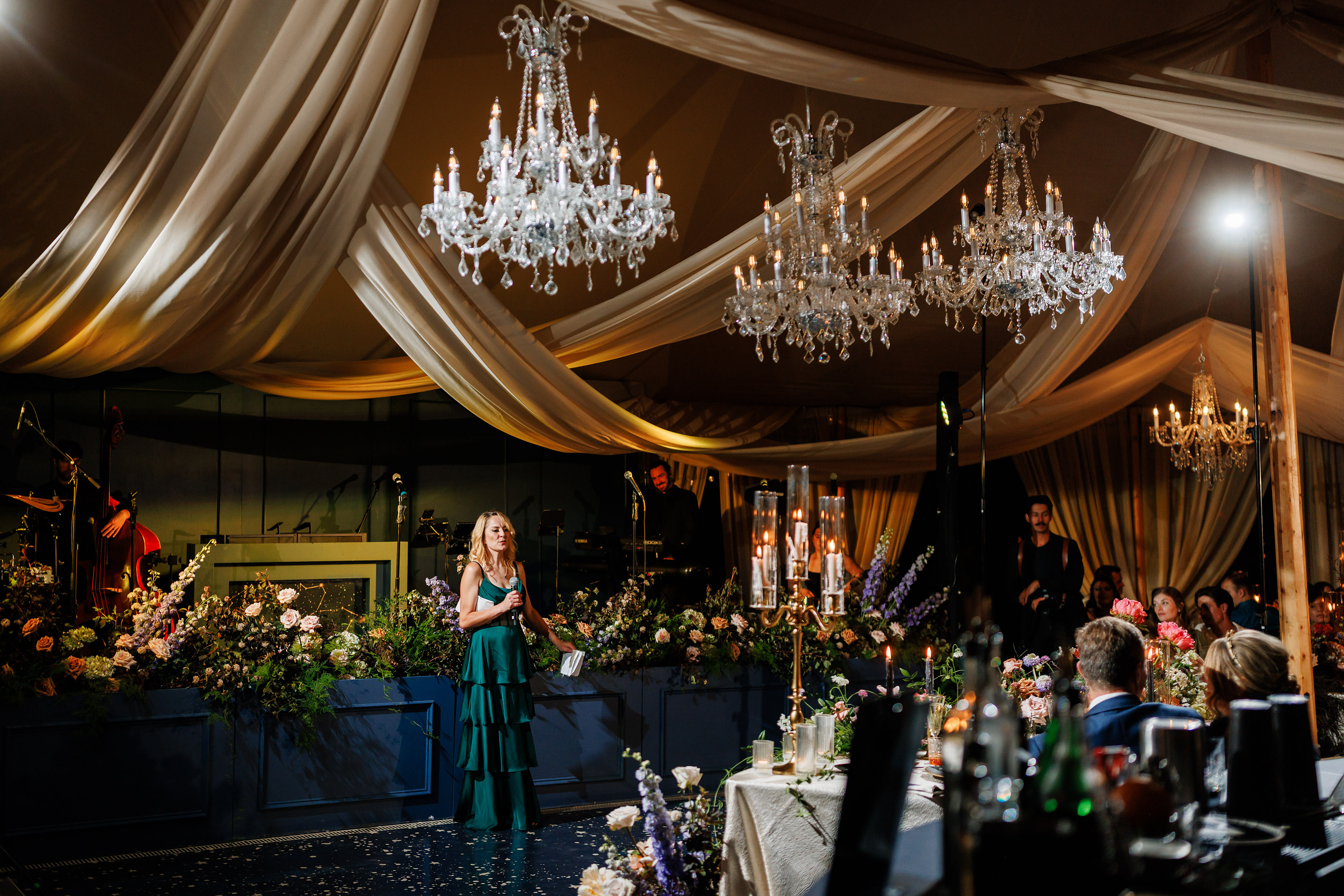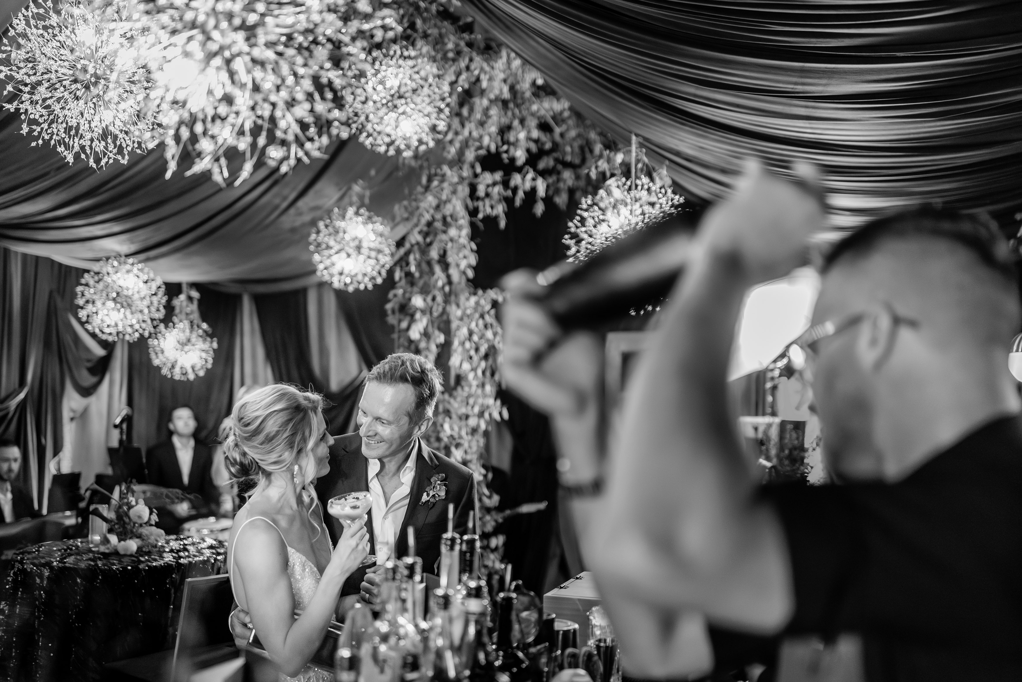 From there, the wedding day became an immersive journey designed to take guests through different “worlds.” The reception began with themes of land, with earthy details and grounded elegance. As the evening unfolded, guests were swept into elements of the sea, where the décor and ambiance shifted into something fluid, vibrant, and full of life. Finally, as night fell, the celebration reached its dazzling conclusion under the stars at a hidden speakeasy bar. Guests danced, toasted, and reveled in an atmosphere that felt as limitless as the universe itself.