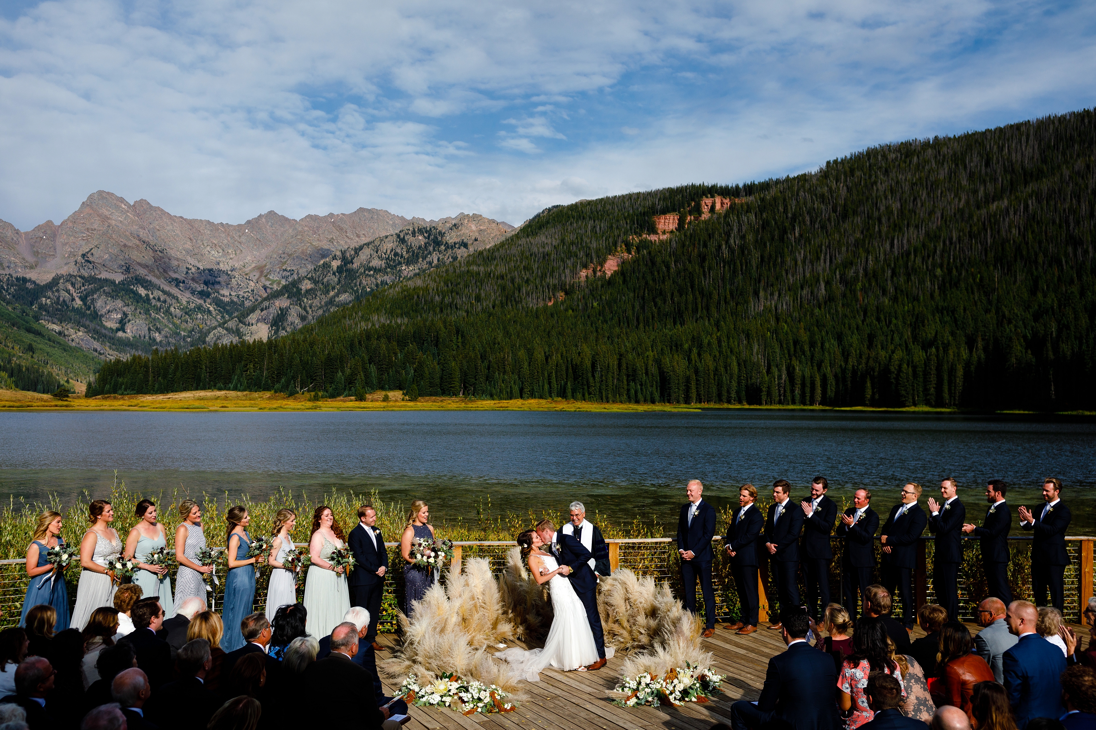 The ceremony and reception spaces are blocked off for private events, even though the area is open to the public. Piney has plenty of benches for ceremony seating and all the amenities needed for your reception. One of the biggest reason’s why Piney makes our shortlist of favorite Vail Wedding Venues is the kind and easy going staff. Some of the Vail Resort venues can be limiting in what you can do or have access to. Piney even allows their couples to take a canoe ride post ceremony once the dock has closed.